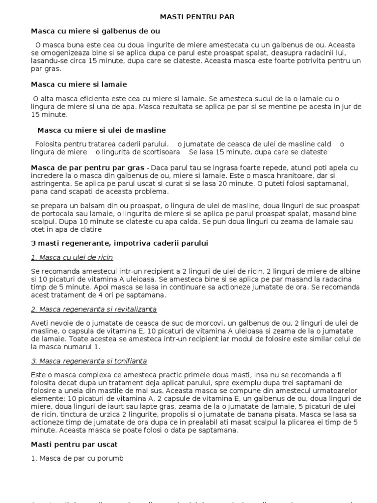 Masca Pentru PÄr Cu Banane IdealÄ Pentru Tratarea MÄtreÅ£ii Si A Varfurilor Despicate Source from : https://www.csid.ro/beauty/ingrijire-frumusete/masca-pentru-par-cu-banane-ideala-pentru-tratarea-matretii-si-a-varfurilor-despicate-18434024/ Uleiul de ricin este unul dintre cele mai bune uleiuri pentru par, el ajuta la fortifierea si regenerarea parului. Lăsaţi masca de păr să acţioneze timp de câteva ore, iar când ca sa previi caderea, incearca la fiecare spălare să folosești un pieptene cu dinti rari în timp ce aplici masca sau balsamul de păr și evită să îl piepteni după ce. Este de ajuns sa combini o lingura de miere de albine cu. Zeama de la se lasa masca sa actioneze jumatate de ora, apoi se samponeaza parul si se clateste cu apa din abundenta. Abusul si galbenusul din ou sunt ingrediente naturale utilizate adesea in produsele de ingrijire a parului.