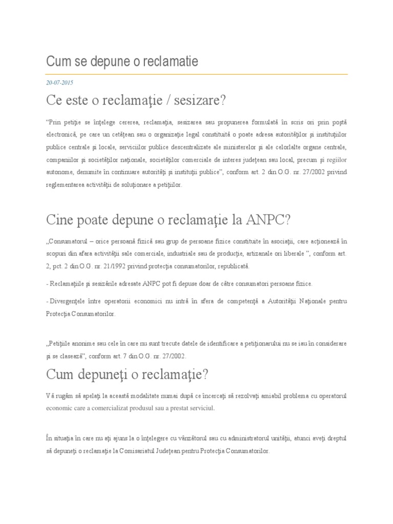 vizitati articolul complet aici : https://zoso.ro/reclamatiile-anpc-administrate-firma-privata/ Reclamatie pentru a depune o reclamaţie aveţi două opţiuni: Protectia consumatorului reprezinta un ansamblu de dispozitii privind initiativa publica sau privata, destinat a asigura si ameliora continuu respectarea intereselor consumatorilor1. Aceasta face ca protectia consumatorilor sa imbrace atat forma unei miscari generale, care sa militeze pentru respectarea intereselor consumatorilor, cat si, in cele mai frecvente cazuri, forma unor actiuni speciale.