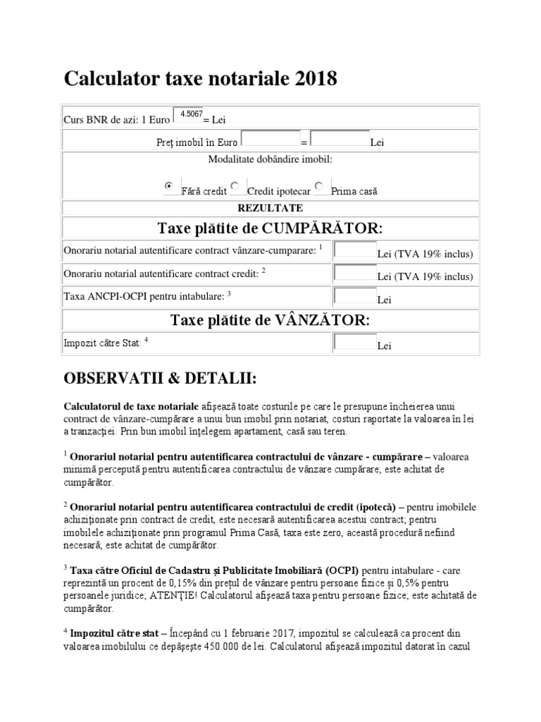 Calculeaza impozit la stat, taxe ancpi si onorariu notarial.