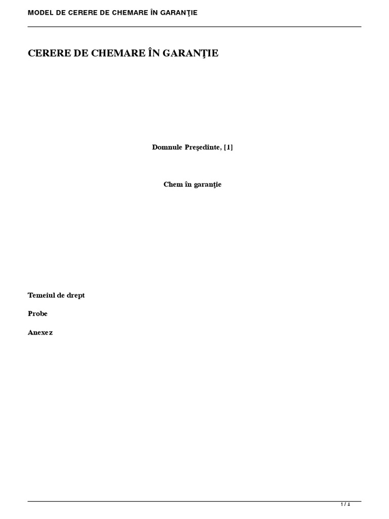 Model cerere de chemare in garanţie discută cu un avocat online 24 7. Cererea de chemare în judecată a altor persoane care ar putea pretinde aceleaşi drepturi ca şi reclamantul poate fi formulată de pârât împreună cu întâmpinarea conform art. Oferă chemarea în garanţie trebuie să îndeplinească toate condiţiile unei cereri de chemare în judecată.