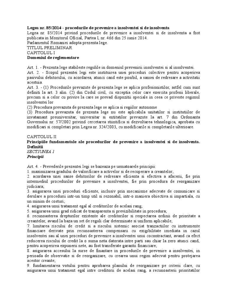 85/2014 privind procedurile de prevenire a insolventei si de insolventa a fost publicata in monitorul oficial nr. Parlamentul romaniei adopta prezenta lege. Procedura colectivă este procedura în care creditorii participă împreună la urmărirea şi recuperarea creanţelor lor, în.
